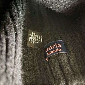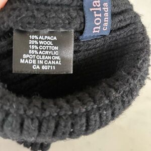 Black, has wool and other materials, minor pilling, cozy, great condition!