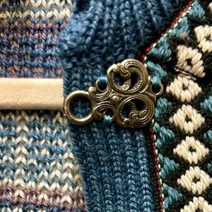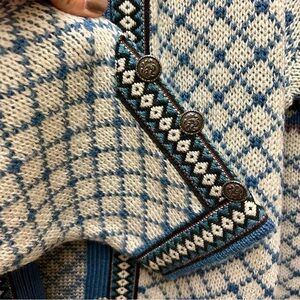 Cozy up in timeless Nordic style with this stunning vintage cardigan by Norlander. Made in Norway from 100% pure new wool, this piece showcases a traditional Scandinavian knit pattern in ivory, blue, and hints of plum. Featuring ornate silver-toned pewter-style clasps and beautifully woven trim, this cardigan is perfect for cold weather layering or après-ski chic.