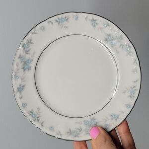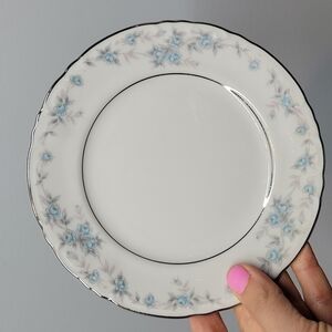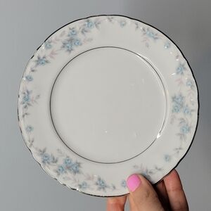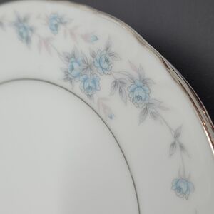 Norleans China Japan. First Love set of 4 round bread & butter plates. Measures 6" across. White with platinum trim and blue & gray floral pattern. Pre-owned.