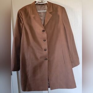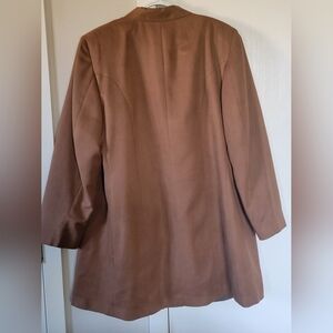 A great wardrobe staple! A fully lined cinnamon colored suit blazer with large front pockets in a faux suede material. Supee soft fabric and a light brown satin like fashion linging. Length will be over hip and is a relaxed fit, some stretch.