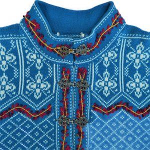 Vintage Fair Isle Cardigan Sweater. Embroidered. Cotton. Antique Silver Metal Ornate Clasp Closure Front. Machine Wash 100% Cotton Knit. Measures Modern US Size XL
