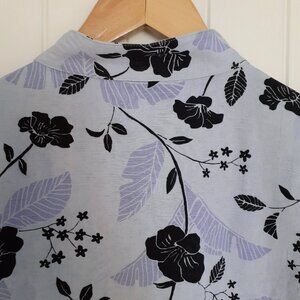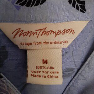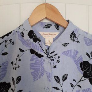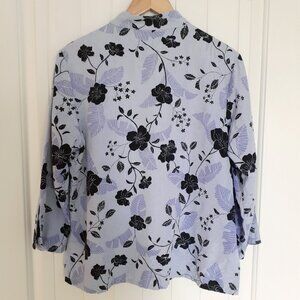 Very good pre-owned condition. Norm Thompson Silk Leaf/Floral Button Up 3/4 Sleeve Mandarin Collar Top. Size: Medium. Color: light blue with a black and purplish-blue floral and leaf print. There is also a very subtle leaf print on the light blue background. Button front, mandarin collar, and slits at side hem and sleeves. Material, being silk, has a slight texture to it.