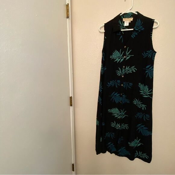 Norm Thompson blue tropical Button front midi sleeveless Rayon beachy dress L