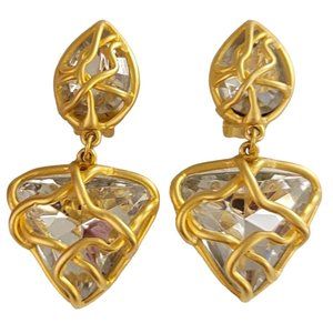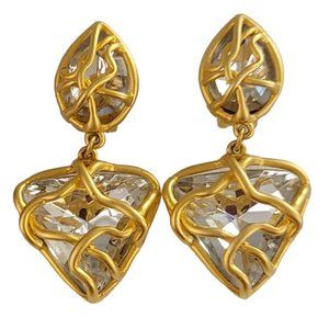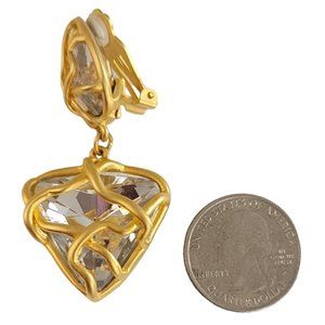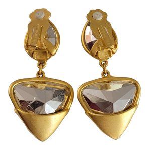 Add a delicate and elegant touch to your outfit with a Matte Gold Tone Modernist Brutalist Dangle Clip-On Earring by Norma Jean. These earrings feature a stunning matte gold-tone colored teardrop-shaped clear rhinestone set inside a cage design, with a matching dangling piece that adds a touch of luxury and elegance. Each earring measures approximately 2.2 inches in total length. Both earrings are hallmarked NORMA JEAN on the clips. The clip-on style back grips the ear lobe so the earrings comfortably stay in place. These versatile clip-on earrings are easy to wear and make the perfect accessory for an on-the-go lifestyle. Please note that the rhinestones are not glass. And there's a light wear to the foil back rhinestones.