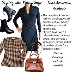vintage fashion, timeless elegance, minimalist style, dark academia, quiet luxury, Parisian chic, gothic elegance, little black dress, wrap dress, sophisticated style, classic wardrobe, old money aesthetic, effortless chic, noir fashion, capsule wardrobe, minimalist, elegant dress, elegant black dress, Norma Kamali dress, black wrap dress, stretchy dress, faux wrap dress, fitted dress, formal dress