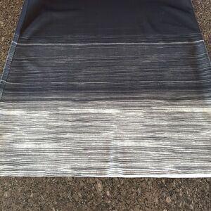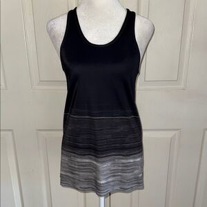 Norma Kamali black ombre striped active racerback tank. Raw hem. Size S. 15 1/8” armpit to armpit laid flat. 26 1/4” shoulder seam to front hem. Very good pre owned condition