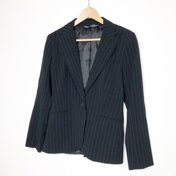 Norma Kamali Black pinstripe, one button closure blazer.