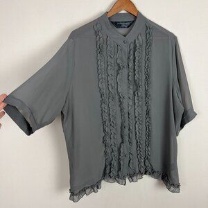 Norma Kamali Blouse Womens XXL Gray Sheer Button Down Short Sleeve Ruffle Bib