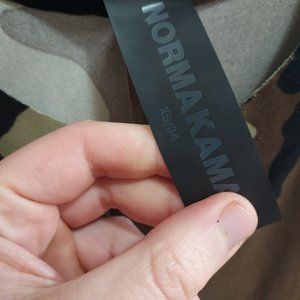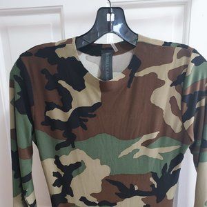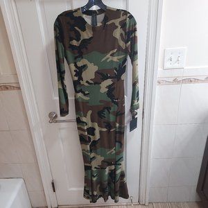 Norma Kamali Camouflage Black Green Fishtail Long Sleeve Crew Fishtail Dress