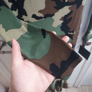Norma Kamali Camouflage Black Green Brown Fishtail Modest Long Sleeve Crew Fishtail Dress