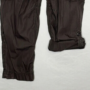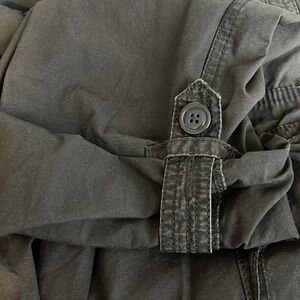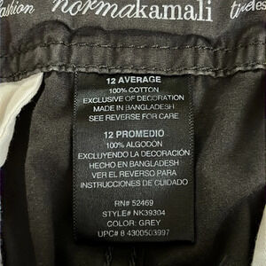 Norma Kamali Convertible Cargo Pants in Grey 100% Cotton Lagenlook - Size 12. Great pre-owned condition. Minor signs of wash wear. Zip fly with button closure, inner drawstring at waist, slant pockets on both sides, zipper pocket on left slant pocket, bit snap flap pockets on both sides and on back rear, roll ups on both hems with buttons to secure, belt loops. Approximate measurements: 19" waist, 10" rise, 31" inseam.