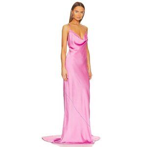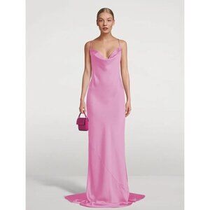 Norma Kamali's gown has a draped cowl neck that beautifully highlights your décolletage. It's cut on the bias from pink satin and has a slim fit and floor-pooling hem. It's an elegant choice for formal events.