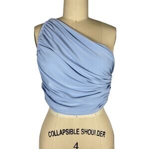 Norma Kamali 'Diana' Blue Polyester Crop Top Size S: one shoulder design, elastic edges, ruched fabric, measurements: 14 inch bust width (unstretched) x 12 inch length (unstretched).