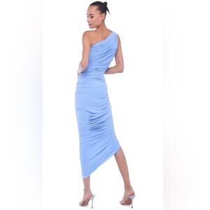 Norma Kamali Diana Dress Draped Goddess One Shoulder Ruched Powder Blue Gown Midi Length Stretch Formal Cocktail Asymmetrical Hem