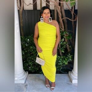 Norma Kamali Diana Dress To Knee Women’s Size XL One Shoulder Buttermilk Yellow Color: "Buttermilk"- bright, neon yellow Features: -Mid-weight ultra stretchy jersey fabric -Built-in bodysuit lining with closed gusset -Ruched design with asymmetric hem -One-shoulder, elastic neckline -Pullover design -Lined Material: Polyester and spandex shell with nylon and spandex lining Measurements: Length- 51” The rest of the measurements are dependent on stretch Condition: Brand new with tags