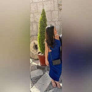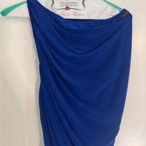 Norma Kamali dress, Norma Kamali gown, blue formal dress, ruched bodycon dress, wedding guest dress, evening gown, asymmetrical hem dress, one-shoulder dress, bodycon midi dress, special occasion dress.