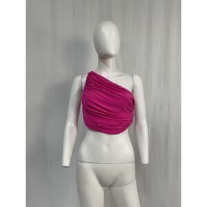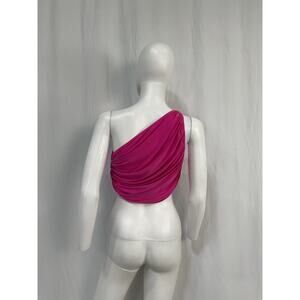 Norma Kamali 'Diana' Pink Polyester Top Size S: elastic neckline, one-shoulder styling, ruched side detail, stretchy bodycon.