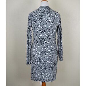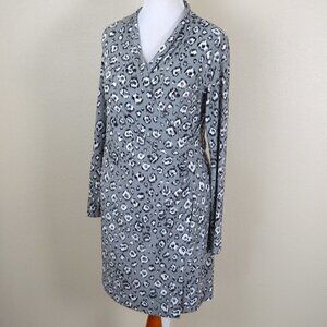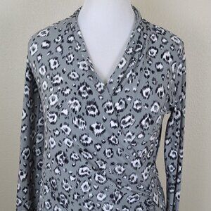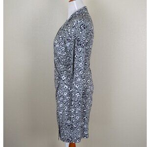 Norma Kamali faux wrap dress, size L. Light gray with black and white leopard print. Long sleeve. V-neck. Stretch material. Gathered mid-section. Stretch material.