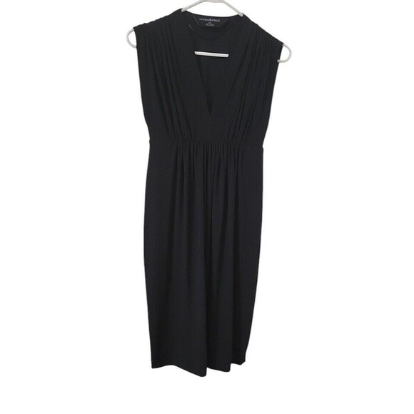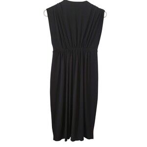 Crafted by renowned designer Norma Kamali, this little black dress is a versatile addition to any wardrobe. The sleeveless, V-neck shift dress in size small offers a flattering midi length, perfect for cocktail parties or weddings. Its ruched detailing and stretch fabric create a slimming silhouette, ensuring a look that's both comfortable and chic.