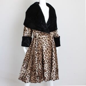 Authentic, preowned, vintage Norma Kamali OMO faux leopard fur coat with oversized shawl collar, likely made in the 80s. Made from a supple faux leopard fur, it features black contrasting faux fur on the shawl collar lining and sleeve cuffs! The collar can be worn in several ways, including as a hood (as we've shown in some of our images). Incredibly chic, it fastens with an inner tie wrap and a flat hook/eye closure.