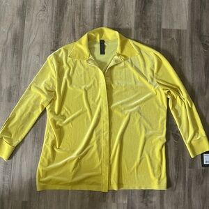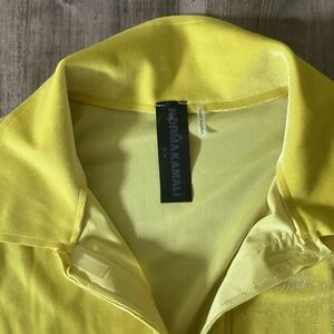 The Norma Kamali Oversize BF NK Shirt in size Medium is a stylish and comfortable tunic-style top designed for women. This solid yellow shirt features long sleeves, a collared neckline, and is perfect for casual occasions. Made with stretch fabric, it is ideal for the summer, fall, and spring seasons. With its oversized fit and brand quality, this shirt is a versatile addition to any woman's wardrobe.