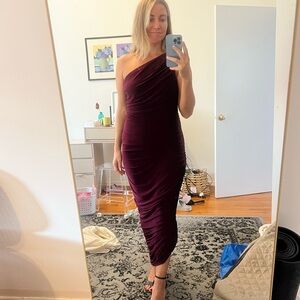 Elegant one shoulder design. Ruched detailing. Perfect for evening wear