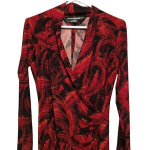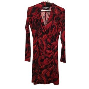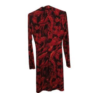 Norma Kamali Red Black Feather Print Size Small Faux Wrap Side Ruched Dress