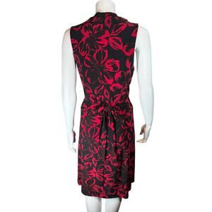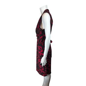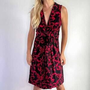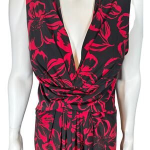 Norma Kamali Red Black Floral V Neck Twist Front Jersey Knit Dress Medium
