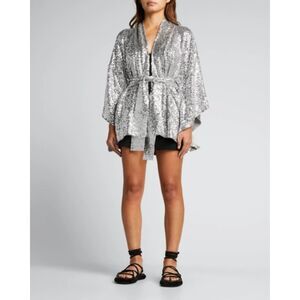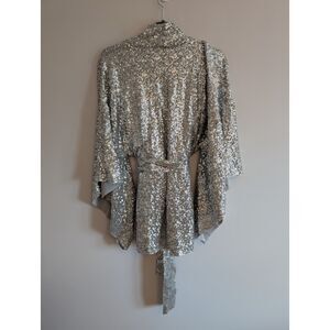 This stunning silver Norma Kamali robe jacket glistens with allover sequins. Features long draped kimono sleeves and a matching sequin tie-front belt. In very good used condition.