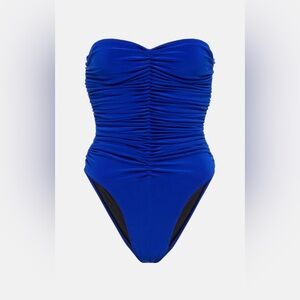 Norma Kamali Slinky Marissa swimsuit Strapless Blue Swimsuit has a sweetheart neckline and high-cut legs. Offering moderate coverage, the strapless design is gathered at the seams for a draped effect.