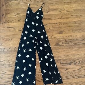Norma Kamali Slip Jumpsuit Black with white star print.