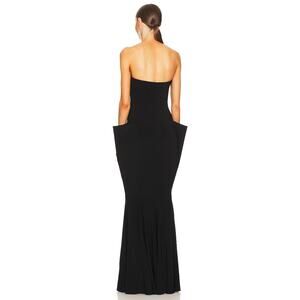 The Norma Kamali Strapless Wing Fishtail Gown in black is a sleek and dramatic maxi dress designed with a strapless neckline and fishtail hem. Perfect for formal events, galas, or evening occasions, this gown combines timeless elegance with modern edge.