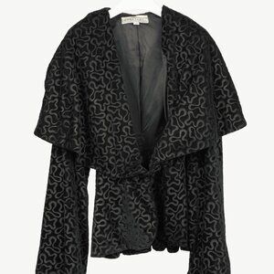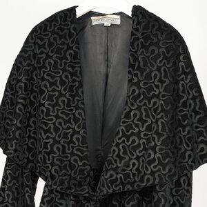 Made in Canada, this vintage jacket from Norma Kamali circa the 80's is crafted in a black velvet with a tonal squiggle patterned all over, and features long bell sleeves, an oversized hooded shawl neckline, a front button closure, a flared hem, and is lined in a tonal satin.