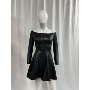 Norma Kamali x Revolve Off Shoulder Black Grace Mini Dress Size XS: unlined, pull-on styling, off-shoulder styling, smooth faux leather fabric. Please note: Light markings on front left right under the bust and on the lower right of the skirt above the hem.