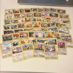 Assorted Pokemon trading cards featuring various characters. Vibrant colors and detailed artwork.