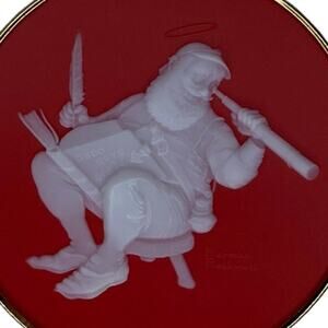 Red circle ornament with Santa looking down on the children double checking his list. Gold tone rim and writing on the back side