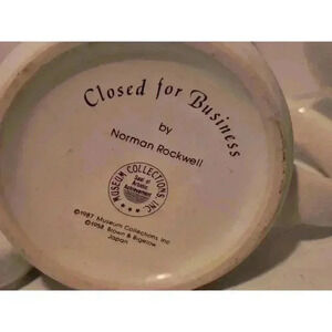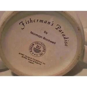 Set of four ceramic mugs featuring Norman Rockwell illustrations. Each mug depicts a different scene of fishing, with titles such as "Trout Dinner", "Fisherman's Paradise", "Cloud for Retirement", and "Catching the Big One". The mugs are approximately 3.5 inches tall and 3.5 inches in diameter. The mugs are in pre-owned condition with minor signs of wear, including some light scratches and fading on the illustrations. The mugs are dishwasher and microwave safe. The set is complete and includes all four mugs.