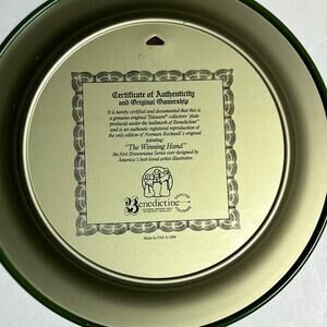 Vintage 1984 Benedictine toleware plate featuring Norman Rockwell’s “The Winning Hand” and Schmidt’s Beer branding. About 10 inches across with Certificate of Authenticity printed on the reverse. Bright colors, minor rim rubs, no dents.