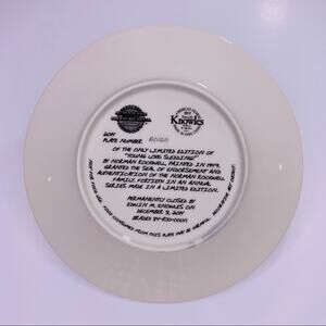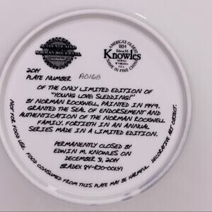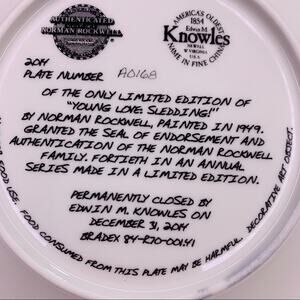 Collectible plate by Knowels. Art by Normal Rockwell, 2014 Young Love: Sledding. Limited edition The Bradford Exchange authentic A0168. Rockwell Christmas Annual. Slight discoloration on the back See pics. 8” collectible plate.