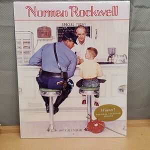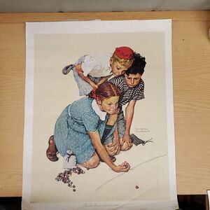 A nice assortment of Norman Rockwell collectibles. A 16x12 canvas print, "knuckles Down" and a new 1997 calendar with Saturday Evening Post Editions, There is a roll of wallpaper border aprox 15' long featuring three rockwell pictures fortune teller, courting couples, on top of the world, A 22 x 17 print of "The Lineman". A calender that has some writing in but pictures are great. There are 2 Christmas ornaments. A coffee mug and a resin figure of a woman taking in the line dried laundry. A great assortment for the Norman Rockwell fan.