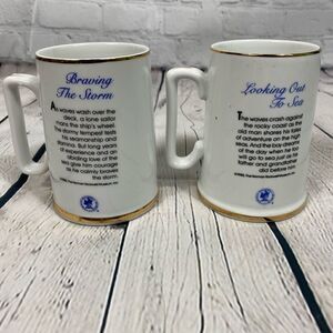 Set of 2 Norman Rockwell Collectible Cups. “Braving The Storm” and “Looking Out To Sea”. White with gold colored trim in excellent condition.