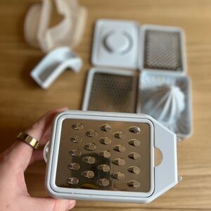 Norpro grater set, multi-grater with container, stainless steel blades, egg separator, citrus juicer, 6-in-1 kitchen tool, compact food prep, dishwasher-safe grater, cheese grater with storage, versatile kitchen gadget.