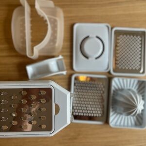 Norpro grater set, multi-grater with container, stainless steel blades, egg separator, citrus juicer, 6-in-1 kitchen tool, compact food prep, dishwasher-safe grater, cheese grater with storage, versatile kitchen gadget.