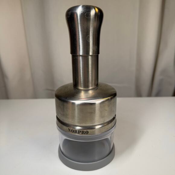 Norpro stainless steel hand chopper with clear catch cup and non-slip base. This manual food chopper uses a rotating blade chopper action to quickly chop and mince small batches of ingredients. Great as a vegetable chopper, onion chopper, garlic mincer, herb chopper, or nut chopper when you want fast prep without plugging in a mini food processor. Includes chopper top, internal blade assembly, and container/base as shown. Approx height about 8 inches (see measuring tape photo).