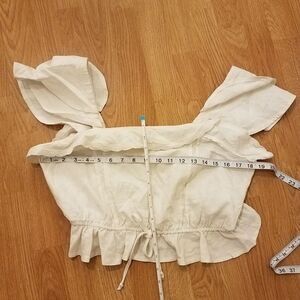 Fluttery sleeves complement a rippled hem flaring from the cinched waist on this breezy linen-blend top. Slips on over head - Square neck - Short sleeves - 55% linen, 45% rayon - Hand wash, dry flat