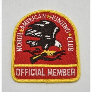 North American Hunting Club Official Member patch is new. Embroidered eagle, gun and bow and arrows on red background with gold trim and white lettering. Patch measures 3-1/8" wide x 3-5/8" high.
