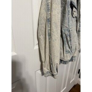 Vintage North Bay World Travel acid washed jean jacket is a unique addition to any wardrobe. The jacket features a full zip and snap closure, with pockets for added convenience. The outer shell material is made of cotton denim, while the lining is made of soft cotton. This jackett is pre-owned and size X Large. There is one snap missing on the front pocket and a very small hole in collar as shown in pictures.