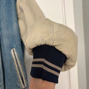 A unique vintage varsity bomber-style jacket by North Bay LTD featuring a denim body, tan sleeves, and classic striped ribbed trim. Embroidered with "Imperial Palace Las Vegas" on the chest. Lightly quilted interior. Note: This piece is in worn vintage condition with visible sleeve stains, minor discoloration, wear on the inside near the tag, and several hand-stitched repairs around the cuffs. Please see photos. Perfect for those who love true worn-in character. This is technically men's, but I wore it as an oversized look (I'm Size S, 26" Waist, 5'5")
