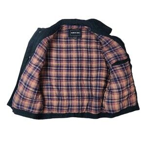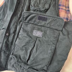 North Bay Vest Mens Size L ( Large ) Black Collared Full Zip Up Closure With Snap Button Cover Over Zipper, Three Hook And Loop Shut Cargo Pockets On Front Of Vest With Two Side Pockets Behind Lower Cargo Pockets. Gorpcore Heavyweight Buffalo Plaid Tactical Tartan Chorewear Utility Rugged Outdoors Style.