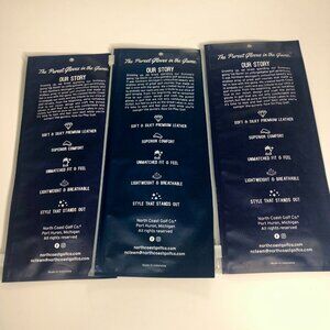 Beautiful quality golf gloves gifted to me but never used due to wrong size. These have never been used and in the original package. North Coast Golf Co. a small company out of Michigan. These gloves are a size small. Original price per glove is $28. Willing to sell individually or the three pack.